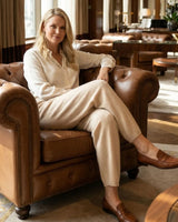 A espessura de cada fio de nosso cashmere é uma fração minúscula da lã tradicional. Esse rigor na seleção proporciona um toque incrivelmente aveludado, criando uma sensação de segunda pele inigualável e um aspecto visual rico e sofisticado.