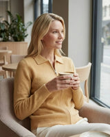 A espessura de cada fio de nosso cashmere é uma fração minúscula da lã tradicional. Esse rigor na seleção proporciona um toque incrivelmente aveludado, criando uma sensação de segunda pele inigualável e um aspecto visual rico e sofisticado.