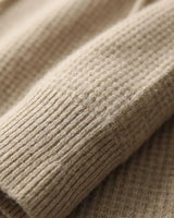 A espessura de cada fio de nosso cashmere é uma fração minúscula da lã tradicional. Esse rigor na seleção proporciona um toque incrivelmente aveludado, criando uma sensação de segunda pele inigualável e um aspecto visual rico e sofisticado.